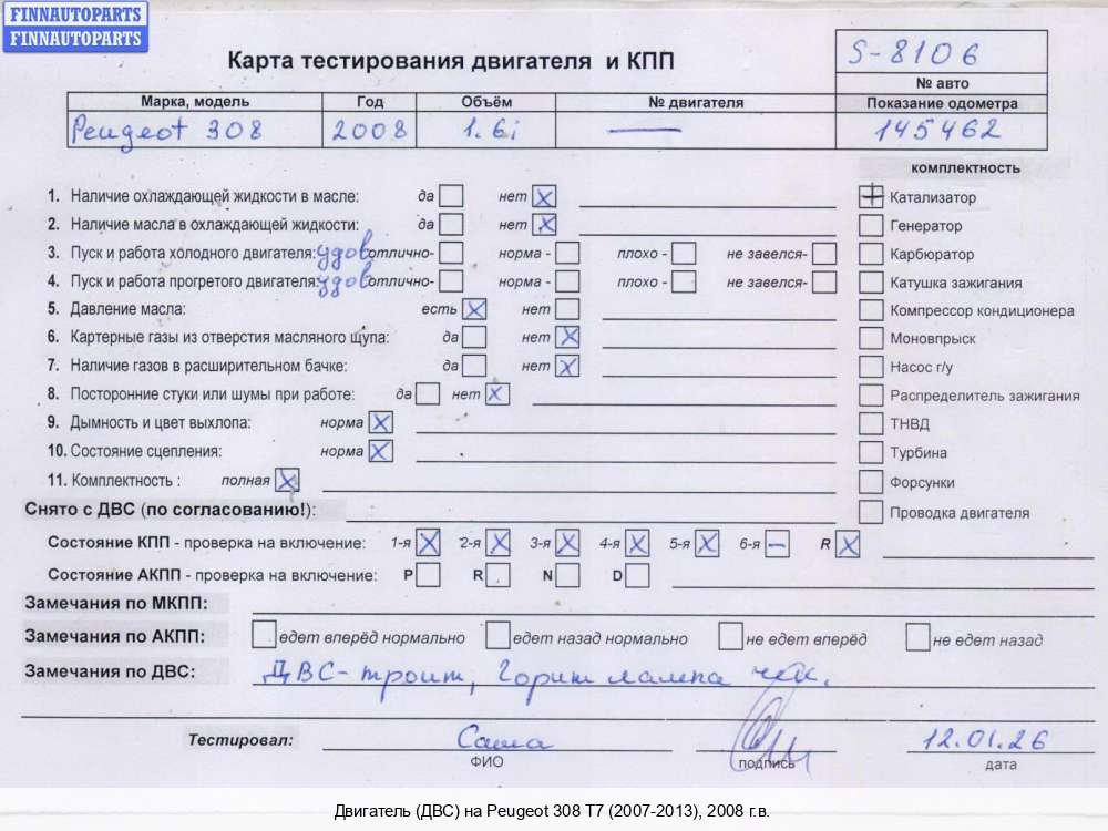 | Алматы (KZ) | 2008 | 0135HV, 2008, 1.6л, Дизель, HDI, 9HV, 9HX, PSA9HX10JBAV000B498, 0135HV, Хэтчбэк 3 дв., серый, PSA9HX10JBAV000B498 | - | Г | К | С | КК | ТУ, прокручивается , состояние ГРМ - нормально, поддон - нормально , клапанная крышка - нормально , эмульсия - нет , подогнуты болты , вмятина на теплообменике, | |||